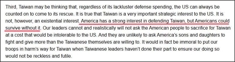 科爾比在文章中直言,“沒有台灣,美國人也能活下去”,“美國領導人不太可能要求美國兒女為台灣而戰”