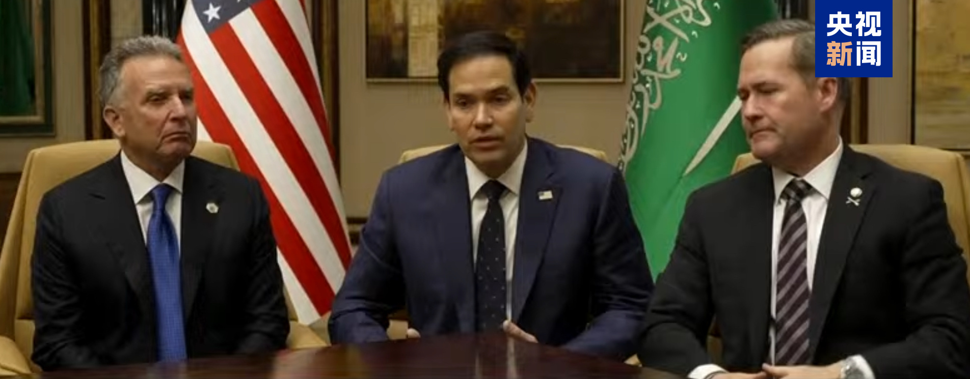 當地時間2月18日下午,美國代表團在結束與俄羅斯代表團的會談後在沙特利雅得召開簡短記者見面會。居中者為美國國務卿魯比奧。 圖自:央視新聞