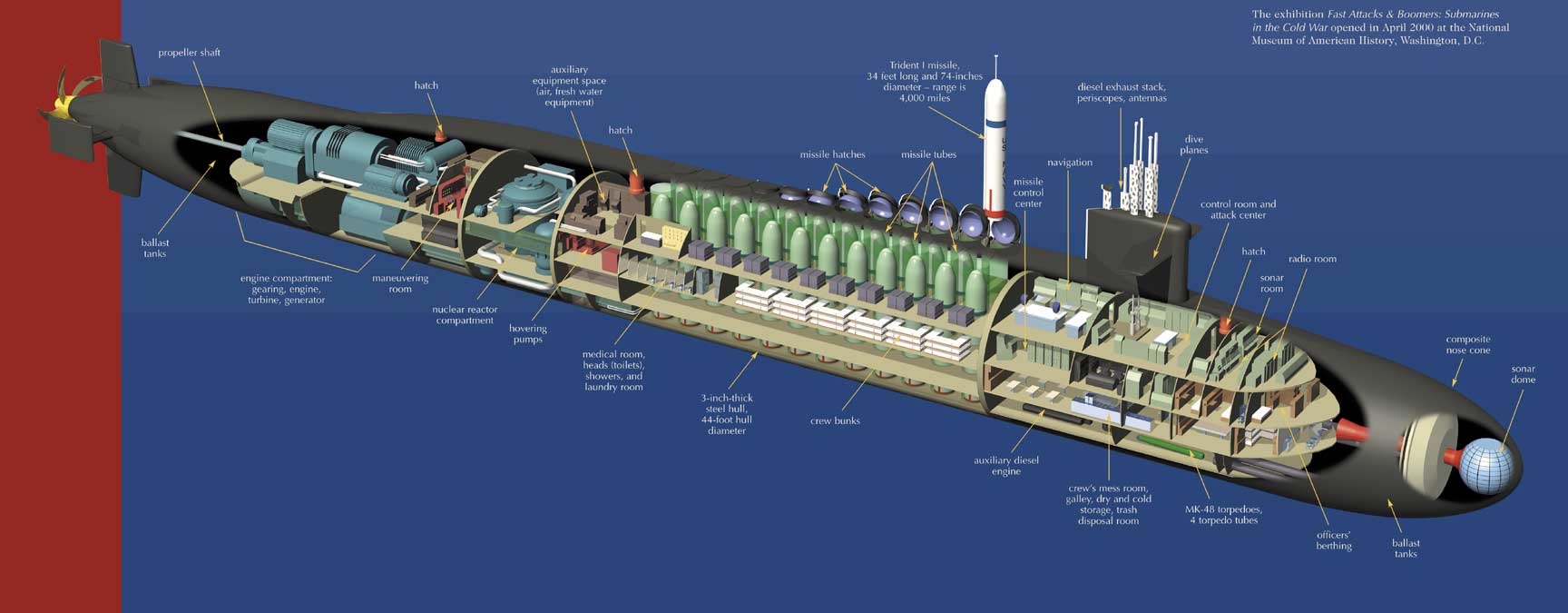 相比之下核潛艇最大的優勢在於其隱蔽性大大超過核轟炸機,同時核潛艇攜帶的核導彈的射程大得多,可攜帶的核彈頭多得多。一枚“三叉戟D5”可以最多攜帶12個W76(10萬噸當量)或者8個W88(47.5萬噸當量)核彈頭,一艘“俄亥俄”級核潛艇可最多攜帶24枚“三叉戟D5”導彈。即使由於核軍控條約,每艘“俄亥俄”級核潛艇只能攜帶不超過20枚導彈、每枚導彈平均不超過4個核彈頭,這依然是很大的數量。