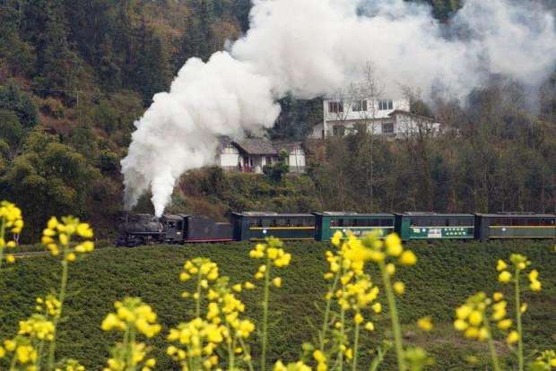△2025年2月14日,四川樂山市犍為縣菜子壩景點試種的早季油菜花進入盛開期,蒸汽小火車穿越油菜花海,吸引不少遊客前來觀看。