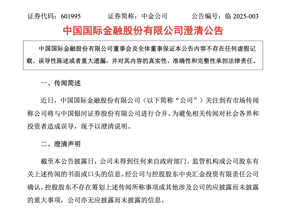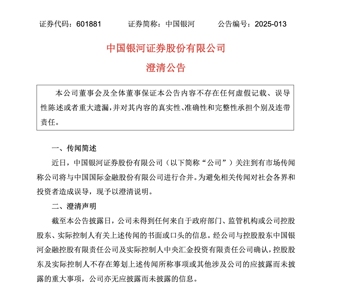 此後晚間,中金公司發佈澄清公告表明,公司未收到來自政府部門、監管機構或股東關於合併傳聞的任何書面或口頭信息,經與控股股東中央匯金投資有限責任公司確認,控股股東並無籌劃相關事項,也不存在其他應披露未披露的重大事項 。中國銀河也發佈類似公告,經與控股股東銀河金控及實際控制人中央匯金確認,不存在籌劃合併事項或其他應披露未披露的重大事項。