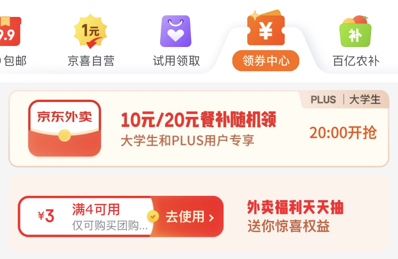 京東外賣上線20元餐補,首批覆蓋PLUS會員和大學生羣體