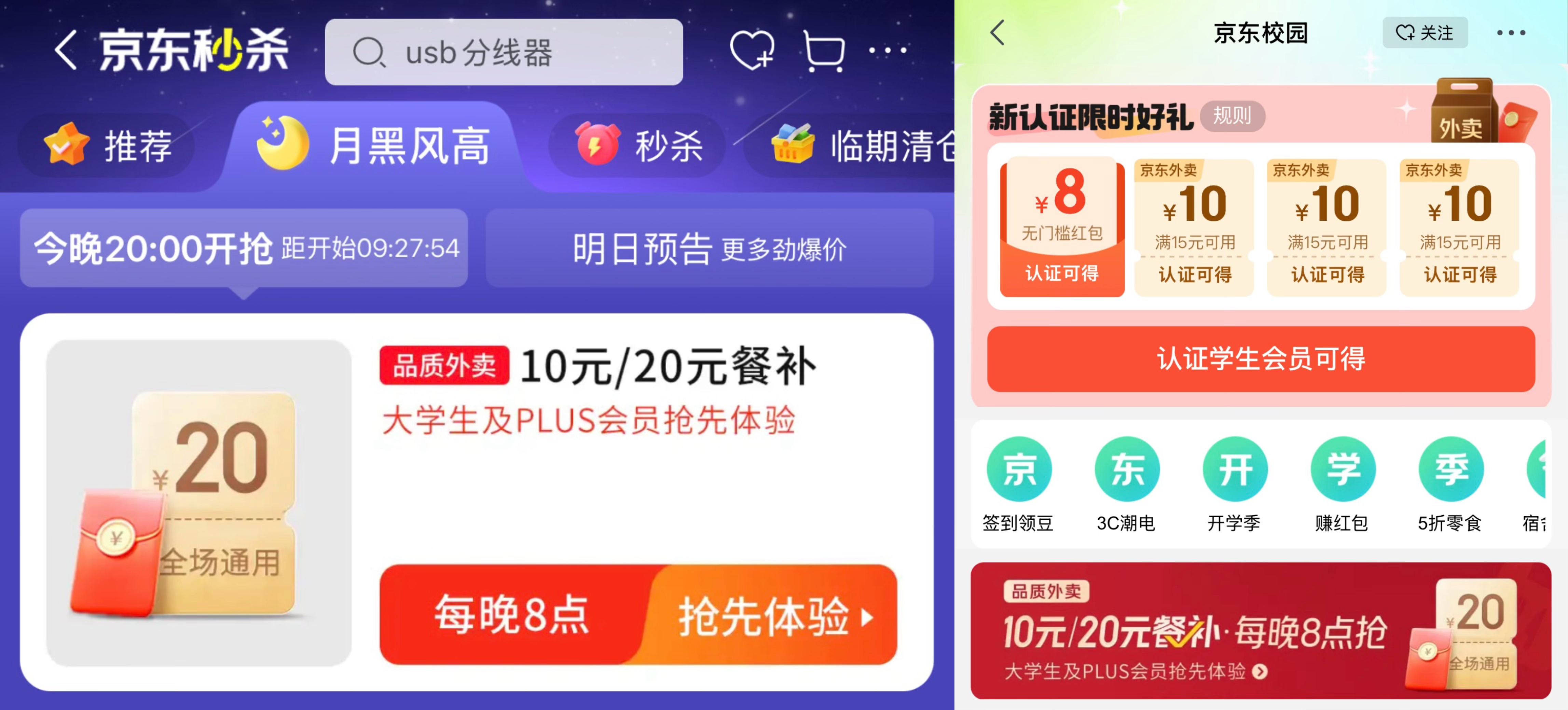 公開資料顯示,該項目首批覆蓋通過京東認證的大學生用户及京東PLUS會員。用户可以通過京東App首頁“品質外賣”頻道入口領取,也可以在京東App搜索“月黑風高”或“京東校園”進行領取。