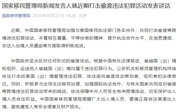 據國家移民管理局微信公眾號2月27日消息,國家移民管理局新聞發言人就近期打擊偷渡違法犯罪活動發表談話。