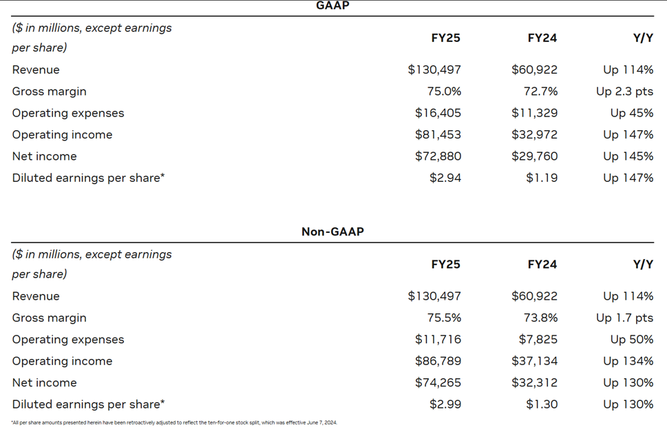 2月27日,英偉達舉行財報電話會議,並公佈其2025Q4財報以及2025財年全年業績。財報顯示,在截至2025年1月26日的2025財年,英偉達全年營收再度超出華爾街預期,達約1305億美元(約合人民幣9472億元),同比增長114%;毛利率增長2.3%,達75%;淨利潤約729億美元(約合人民幣5298億元),同比增長145%。