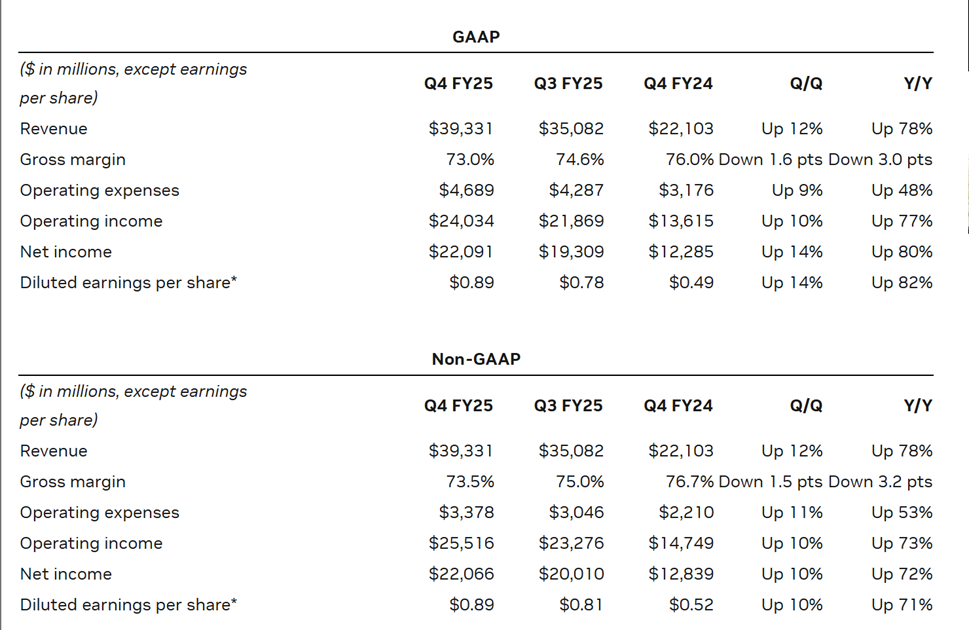 2025財年第四財季,英偉達營收393億美元(約合人民幣2852億元),同比增長78%,環比增長12%;淨利潤為220億美元(約合人民幣1596億元),同比增長80%,環比增長14%;毛利率由上一季度的74.6%降至73.0%,較去年同期的76%下降了3個百分點。