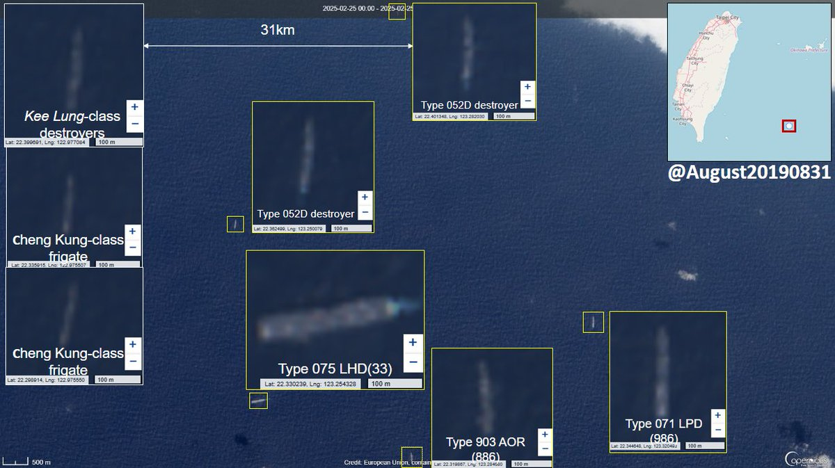 而在此前一天,台軍“基隆”級驅逐艦在台灣東部海域和我075型兩棲攻擊艦對峙。社交媒體上流傳的2月25號的衞星圖像顯示,解放軍075型兩棲攻擊艦領銜的兩棲打擊羣,包括1艘071型兩棲船塢登陸艦、2艘052D型驅逐艦和1艘903型綜合補給艦位於台島以東約250公里處活動,台軍1艘基隆級驅逐艦和2艘成功級護衞艦位於台島一側進行監視。