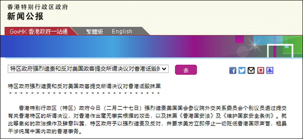 據香港特區政府新聞公報,2月27日,香港特區政府強烈譴責美國國會參議院外交關係委員會個別議員透過提交有關香港特區的所謂決議,對香港作出毫無事實根據的攻擊,以及抹黑《香港國安法》及《維護國家安全條例》。就此等卑劣的政治操作及肆意叫囂,特區政府予以強烈譴責及反對,並要求美方立即停止一切貶低香港國際聲譽、粗暴干涉純屬中國內政的香港事務的行為。