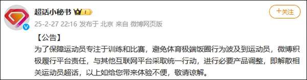 超話社區官方微博客服@超話小秘書 2月27日發佈公告稱,為了保障運動員專注於訓練和比賽,避免體育極端飯圈行為波及到運動員,微博積極履行平台責任,與其他互聯網平台採取統一行動,進行必要產品調整,即解散相關運動員超話,以上如給您帶來體驗不便,敬請諒解。