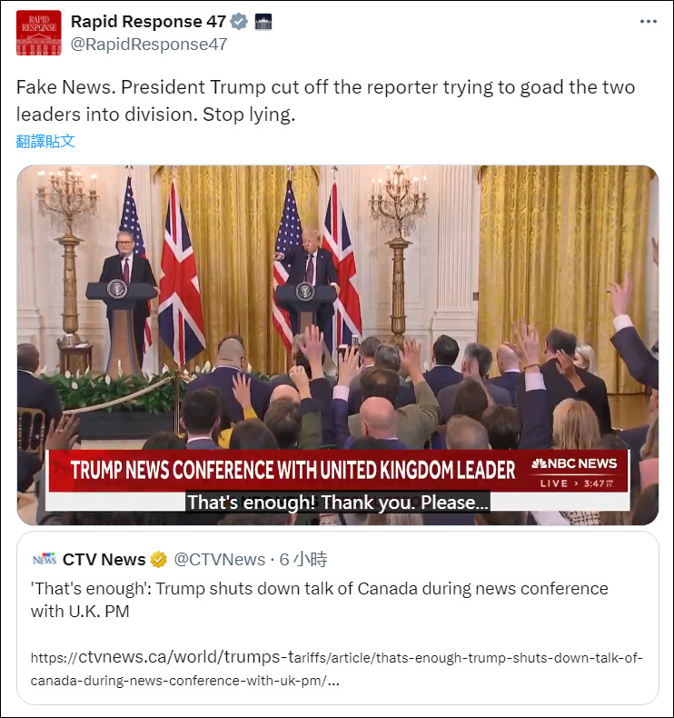 特朗普官方快速反應賬號“RapidResponse47”轉發了CTV的推文,駁斥其為“假新聞”,“特朗普總統打斷了試圖引發兩國領導人分歧的記者,停止撒謊吧。”