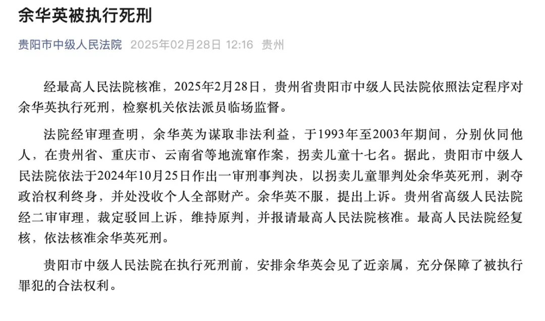 2025年2月28日,貴州省貴陽市中級人民法院依照法定程序對餘華英執行死刑。
