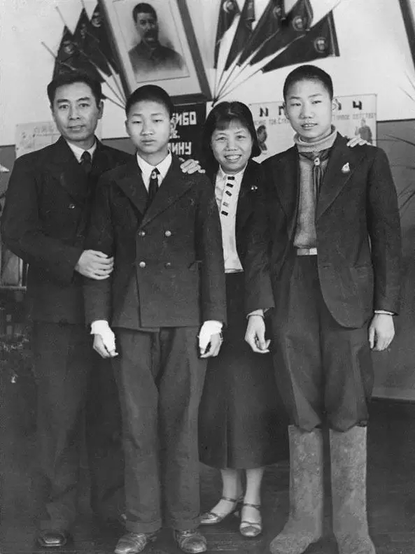 1940年1月,周恩來在莫斯科治療臂傷期間,與鄧穎超在國際兒童院看望毛岸英(右一)與毛岸青