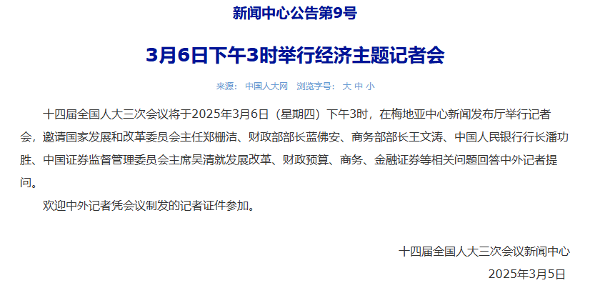 十四屆全國人大三次會議將於2025年3月6日(星期四)下午3時,在梅地亞中心新聞發佈廳舉行記者會,邀請國家發展和改革委員會主任鄭柵潔、財政部部長藍佛安、商務部部長王文濤、中國人民銀行行長潘功勝、中國證券監督管理委員會主席吳清就發展改革、財政預算、商務、金融證券等相關問題回答中外記者提問。