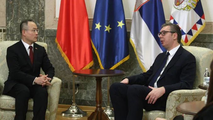 據中國駐塞爾維亞大使館微信公眾號消息,3月5日,駐塞爾維亞大使李明前往塞總統府拜會武契奇總統。