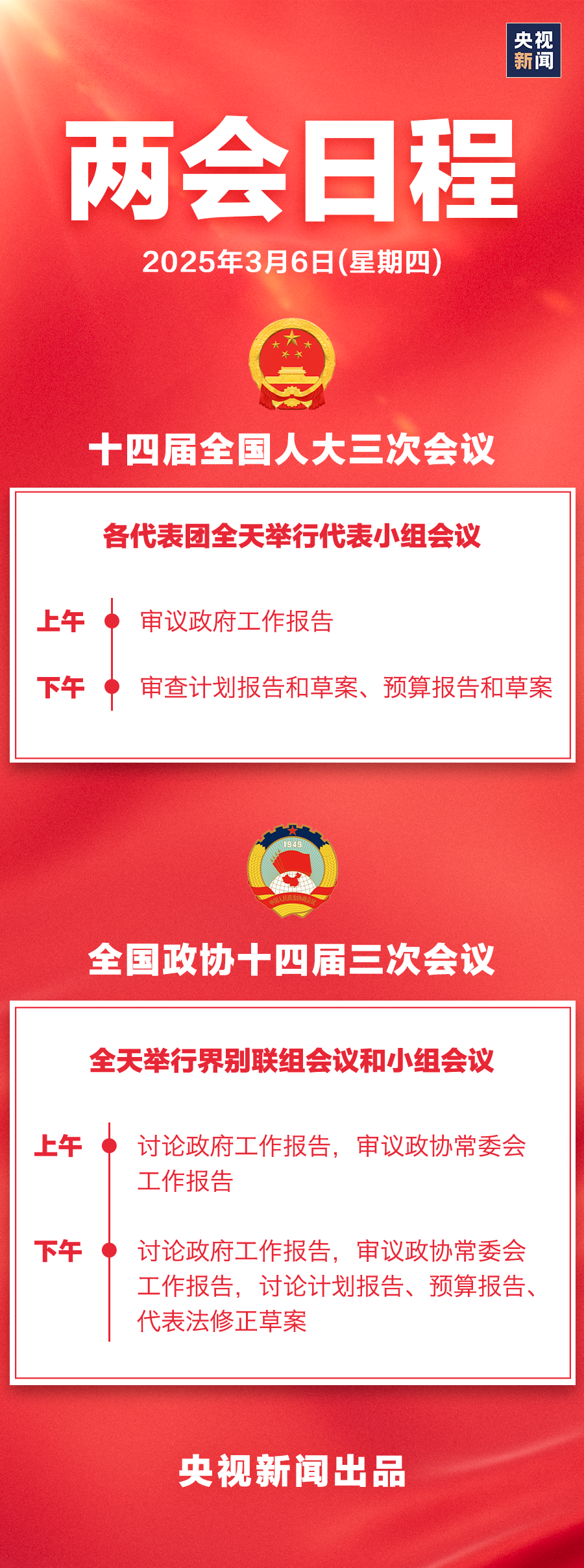 全國政協十四屆三次會議6日全天舉行界別聯組會議和小組會議。上午討論政府工作報告,審議政協常委會工作報告;下午討論政府工作報告,審議政協常委會工作報告,討論計劃報告、預算報告、代表法修正草案。