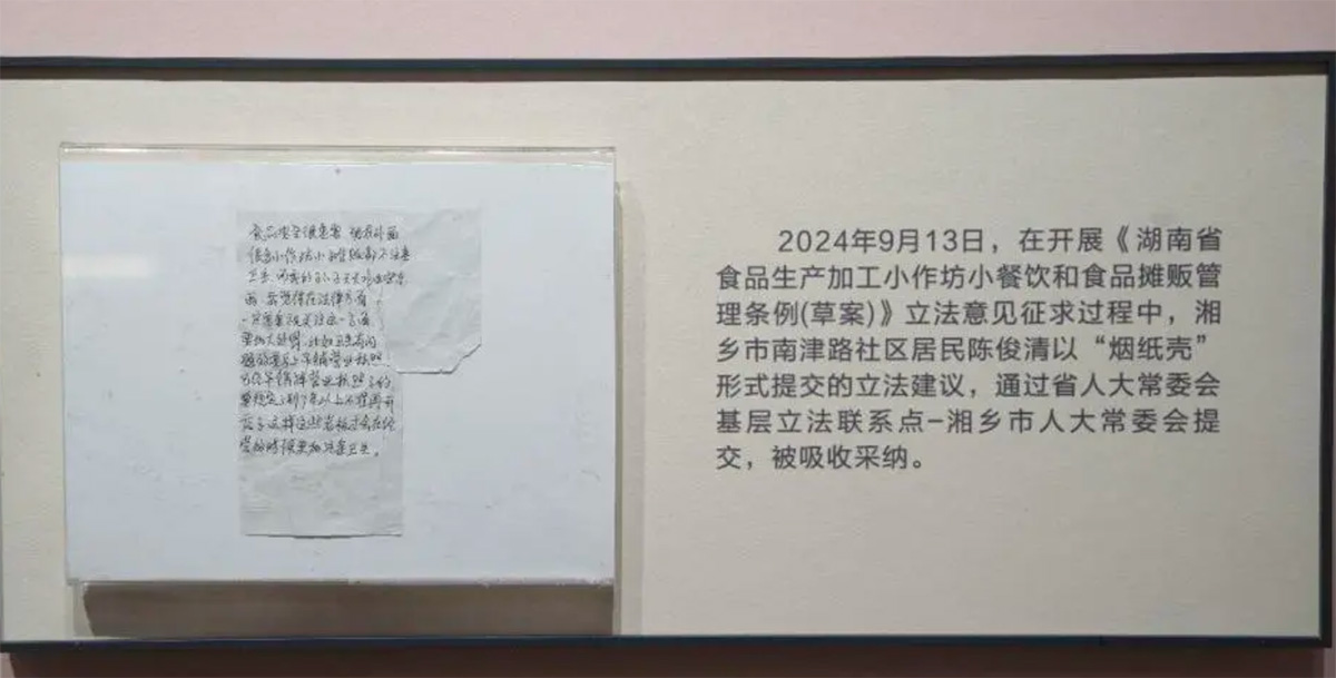 隨後,他將這張紙條遞給湘鄉市崑崙橋街道南津路社區居委會書記張先林,後來,張書記告訴陳俊清,這張錫紙的原件已經被“人民代表大會制度湖南實踐展”收藏了。