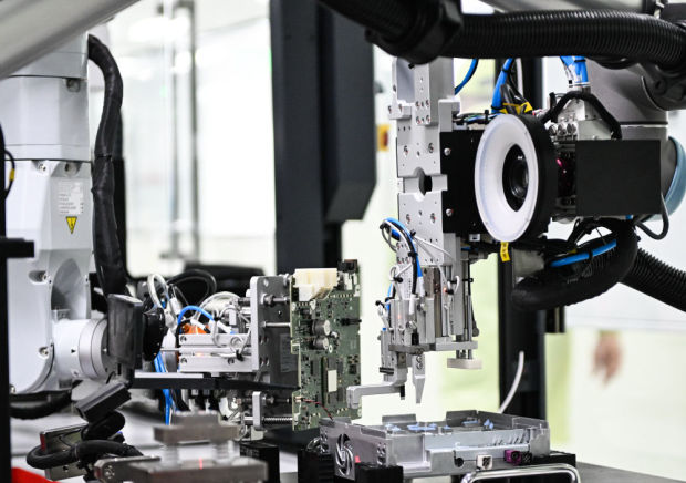 2024年2月27日,在江蘇無錫車聯天下信息技術有限公司,機器人在生產智能網聯汽車座艙域控制器。近年來,無錫市全力提升產業創新能力和數字化綠色化發展水平,一批企業通過生產換線、人機協同、“上雲用數賦智”等,打造智能工廠、智能車間,推動企業降本、提質、節能、增效,為製造業高質量發展提供新動能。