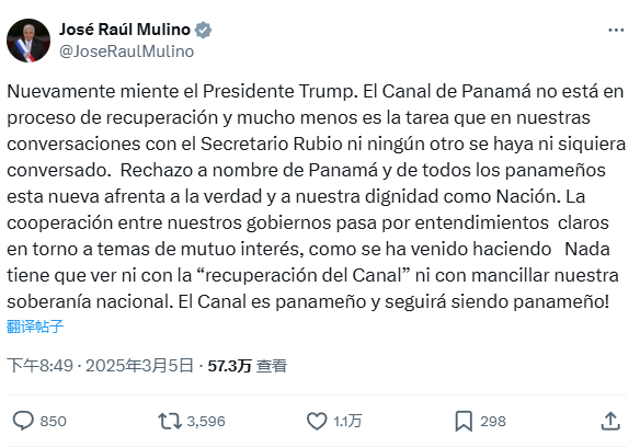 隨後,穆利諾在社交平台上回懟“特朗普總統又在撒謊了”。他表示,巴拿馬方面不曾也不會跟包括美國國務卿魯比奧在內的美方代表討論改變運河歸屬的問題,並痛斥特朗普的言論是對事實和巴拿馬國家尊嚴的侮辱。