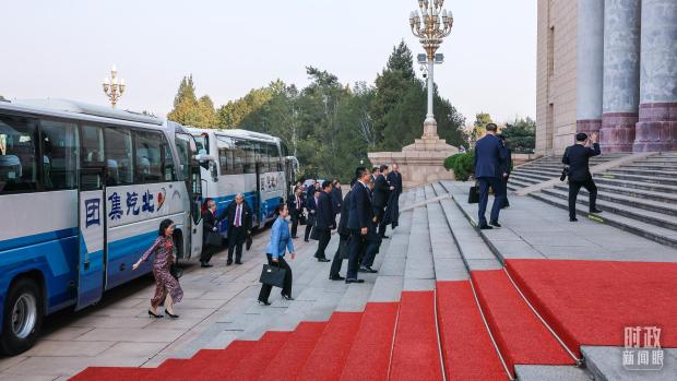 △代表們陸續抵達人民大會堂。(總枱央視記者周倜拍攝)
