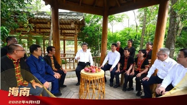 2022年4月,總書記來到海南五指山市水滿鄉毛納村考察調研。村寨涼亭裏,鄉親們正議農事。
