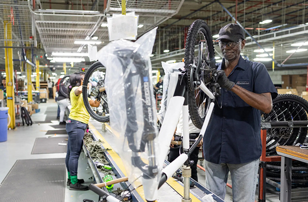 工人們在工廠裏組裝自行車。 美媒