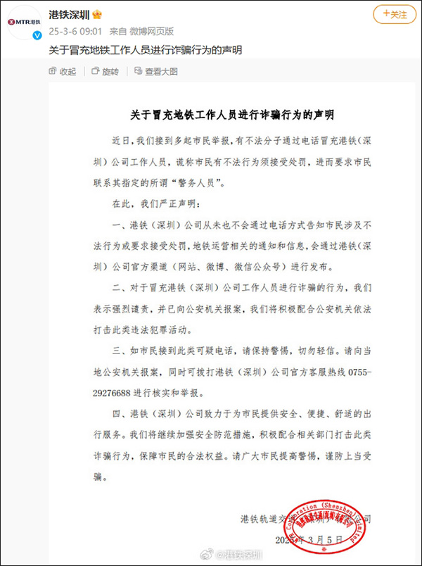 港鐵軌道交通(深圳)有限公司@港鐵深圳 3月6日發佈關於冒充地鐵工作人員進行詐騙行為的聲明。