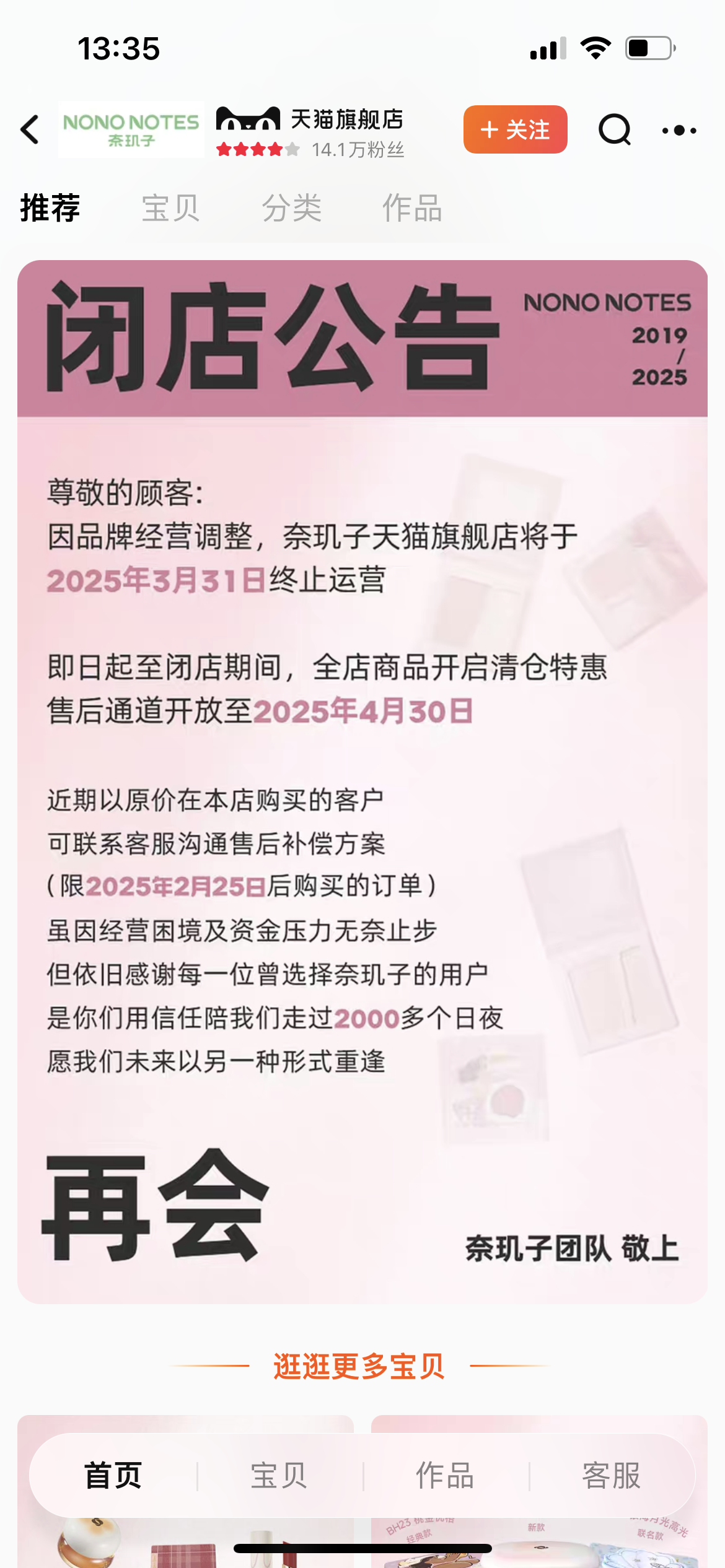 3月5日,國貨彩妝品牌NonoNotes 奈璣子在社交平台發佈 “告別信”,宣佈即日起對剩餘庫存產品進行低價促銷清倉,各平台官方店鋪將於 2025年3月底陸續停止銷售,售後服務持續至2025年4月30日。庫存產品清倉所得收益將優先用於結清供應商應付款項和員工遣散補償。