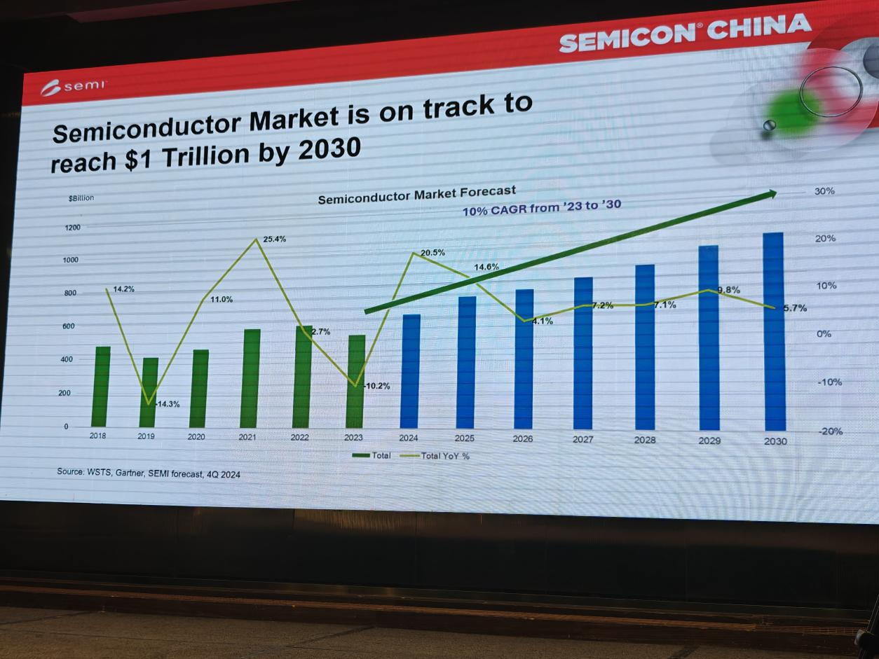 SEMI全球副總裁、中國區總裁居龍向觀察者網表示,半導體產業目前正面臨前所未有的機遇與挑戰。人工智能、自動駕駛、物聯網等新興應用持續推動半導體需求增長,包括服務器與數據中心芯片等。他指出,2024年全球半導體市場實現強勁反彈,產業規模增長19.1%,達到6280億美元,未來仍將保持兩位數增長,預計到2030年全球半導體產業規模將突破1萬億美元。