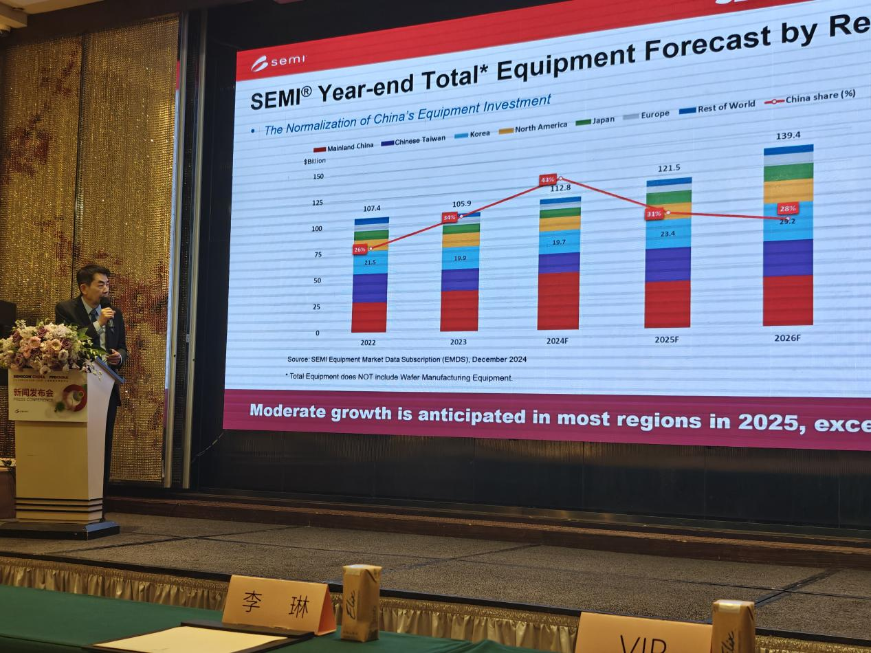 居龍提到了當前產業發展的重點,包括服務器與數據中心芯片的快速增長,這主要由AI需求驅動。此外,智能汽車、物聯網、先進封裝技術等也將成為未來產業發展的重要領域。居龍指出,中國在過去的2022、2023、2024三年都是全球最大的半導體設備銷售市場,佔比在2024年達到了43%。儘管預測2025年中國區銷售可能下降,但未來仍將持續投資。