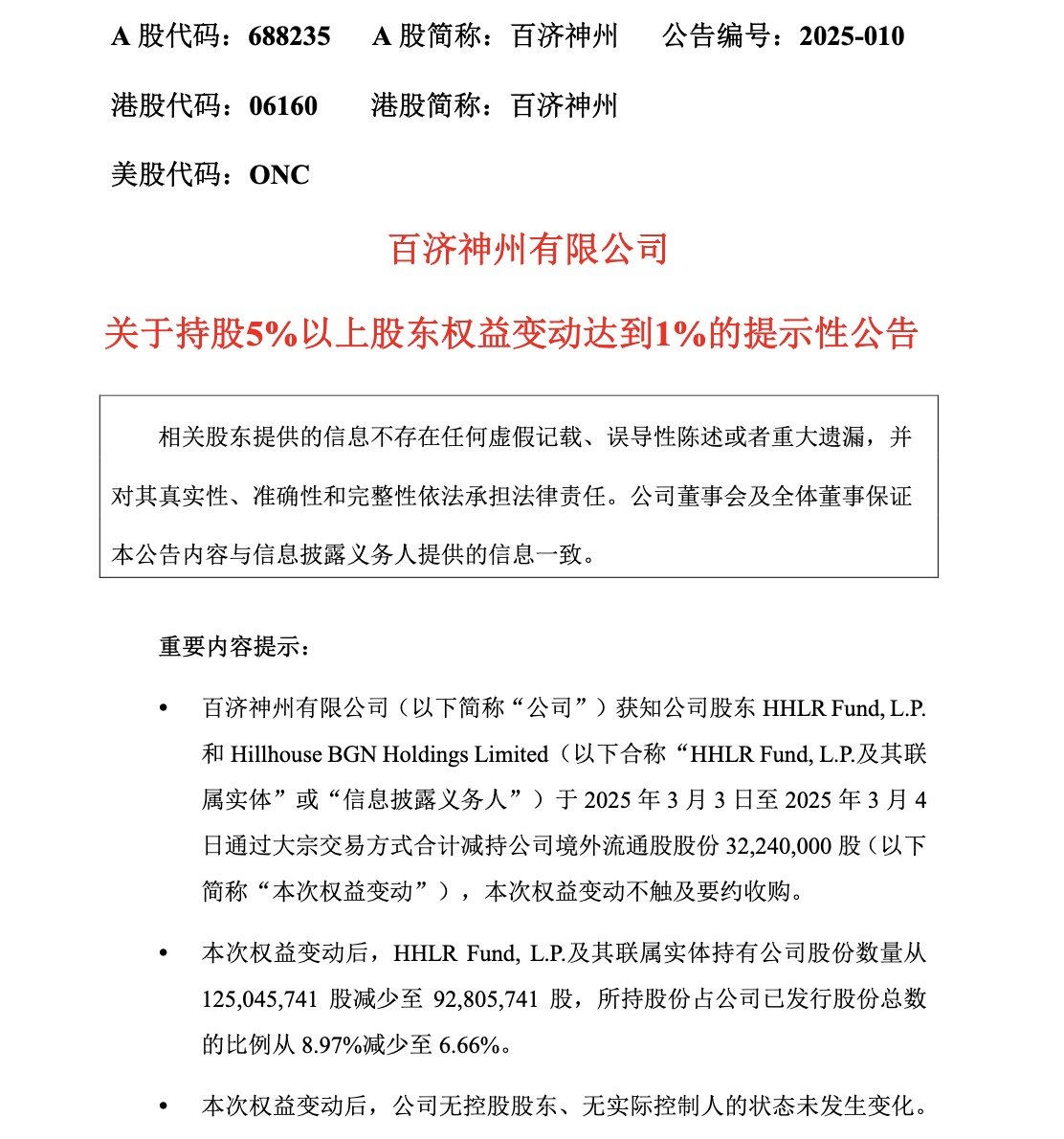 3月7日,創新藥龍頭企業百濟神州(ONC.NS,688235.SH,06160.HK)發佈公告稱,已獲知公司股東HHLR Fund,L.P.和Hillhouse BGN Holdings Limited(以下合稱“HHLRFund,L.P.及其聯屬實體”)於3月3日至4日通過大宗交易減持境外流通股3224萬股,持股比例從8.97%降至6.66%。