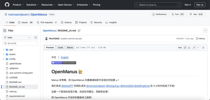 據悉,該項目的作者均為此前MetaGPT的核心貢獻者,而相較於Manus背後的Monica,其實MetaGPT此前的知名度還要更高一點。MetaGPT是國內AI Agent創業公司DeepWisdom(深度賦智)於2023年發佈的一款多智能體協作框架,當時一經開源,就火爆全網,如今在GitHub上已經收穫了49.7k stars。