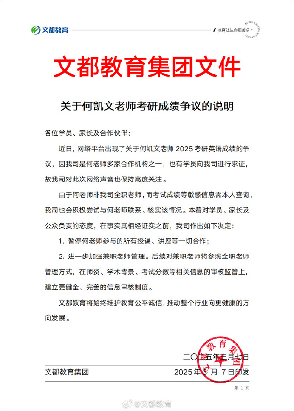 3月7日,@文都教育 發佈關於何凱文老師考研成績爭議的説明。