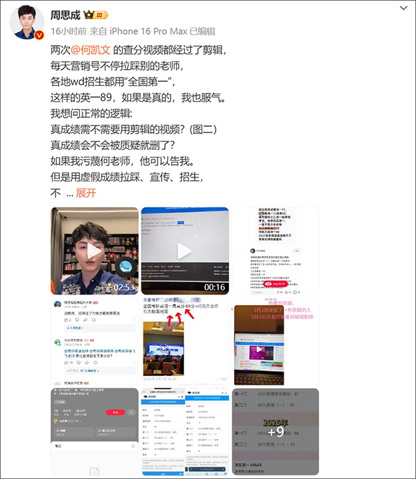 3月5日,考研名師周思成公開質疑考研老師何凱文成績造假,周思成發文稱何凱文公佈分數截圖、查分視頻為P圖和拼接。