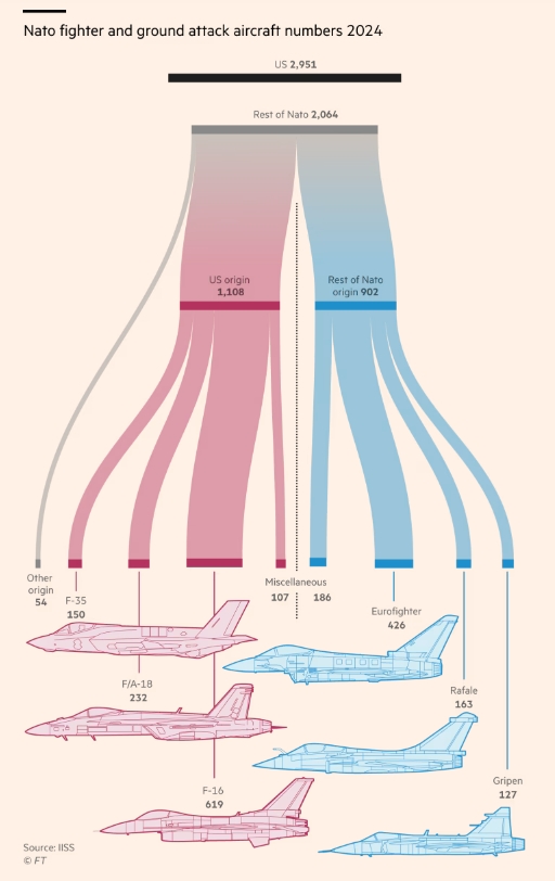 截至2024年,北約成員國的戰鬥機和地面攻擊機數量 《金融時報》製圖
