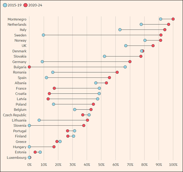 美國武器佔部分歐洲國家進口武器的比例變化圖,藍色圓點為2015年至2019年的比例,紅色圓點為2020年至2024年的比例。 《金融時報》製圖