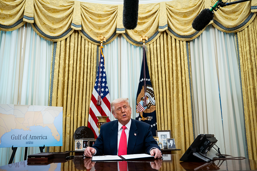 當地時間2025年3月6日,美國華盛頓特區,特朗普在白宮橢圓形辦公室簽署行政命令,暫停對來自加拿大和墨西哥的USMCA貿易的關税 視覺中國