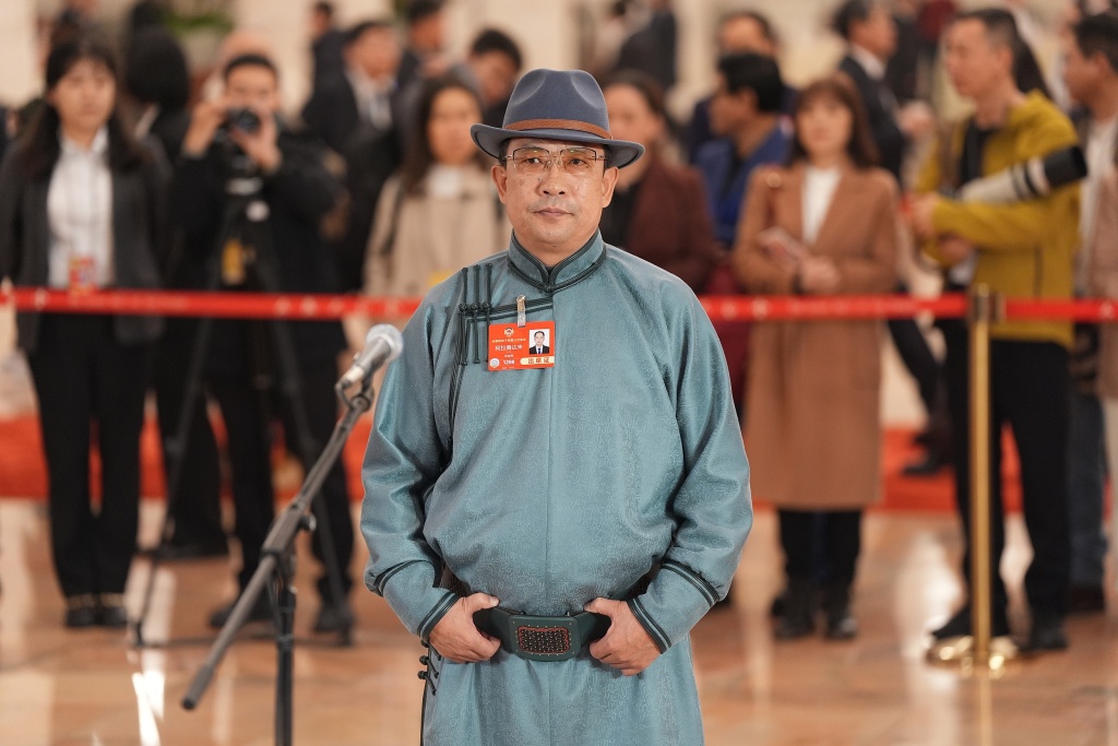 2025年3月10日,全國政協十四屆三次會議第三場“委員通道”集體採訪活動在人民大會堂中央大廳北側舉行。全國政協委員阿拉騰達來。 視覺中國 圖