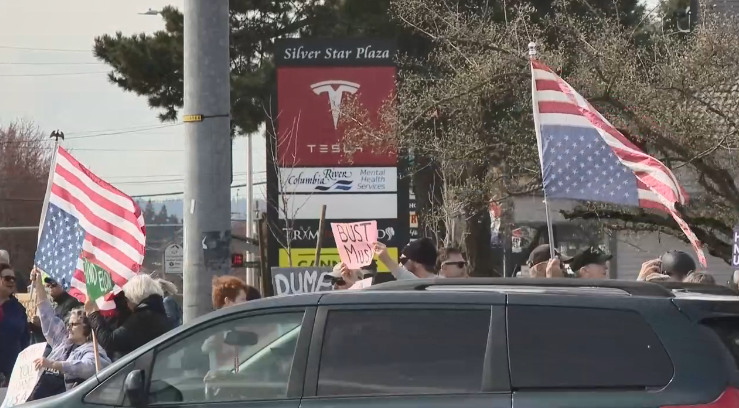 3月9日下午,華盛頓州温哥華市的一家特斯拉門店外也發生了抗議活動。