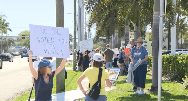 當地時間3月8日,數十名抗議者在佛羅里達州德拉海灘特斯拉門店外示威。 哥倫比亞廣播公司旗下WPEC