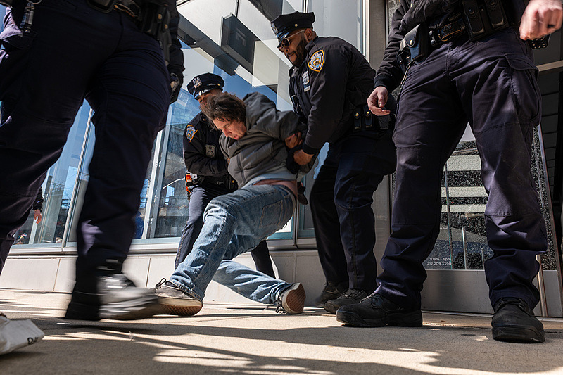 當地時間3月8日,美國紐約市,警方逮捕在曼哈頓特斯拉門店聚集的抗議者。 視覺中國