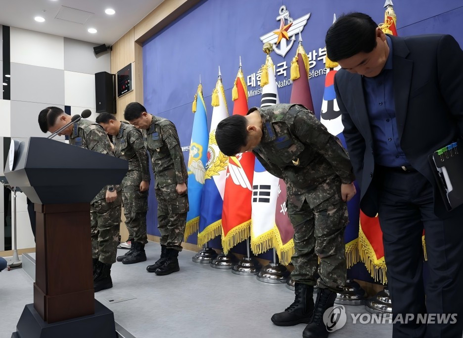 3月10日,在首爾龍山區的國防部大樓,韓國空軍參謀總長李英秀(前排)舉行記者會,就空軍戰鬥機參加演習時誤投彈至居民區一事鞠躬致歉。 韓聯社