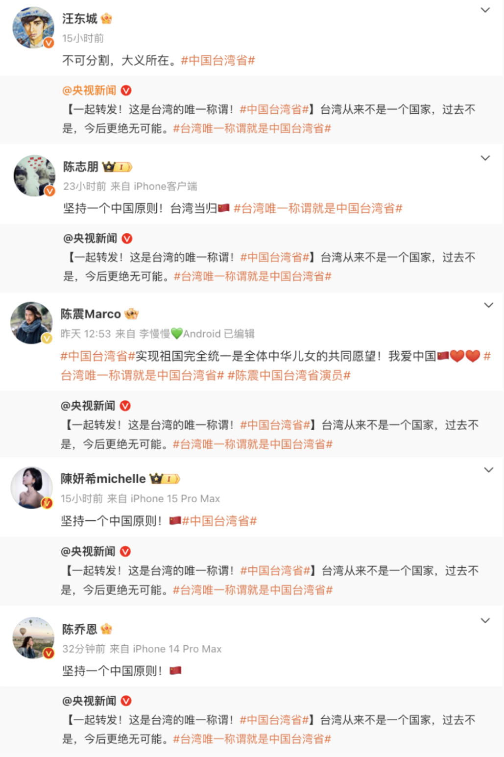 @央視新聞 同日發佈海報,以中國二字、五星和台灣島作為設計主體,配合“台灣必歸”的文案。據台媒統計,至少20名台灣藝人也帶#中國台灣省 話題轉發此條微博。