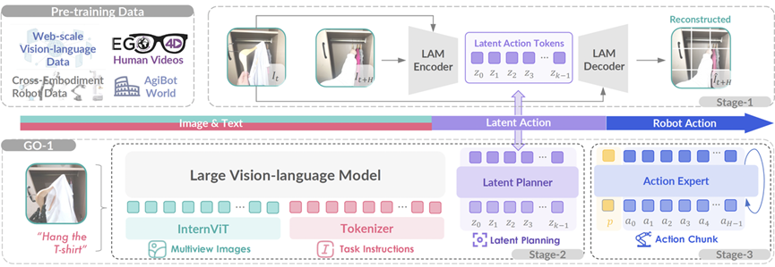 具體來説,VLM作為通用具身基座大模型的主幹網絡,繼承開源多模態大模型InternVL2.5-2B的權重,利用互聯網大規模純文本和圖文數據,讓GO-1大模型具備了通用的場景感知和理解能力。
