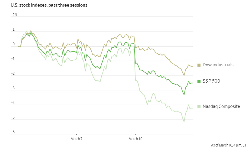 當地時間3月10日,華爾街股市暴跌,科技股拋售加劇。當天,標準普爾500指數下跌2.7%,該指數上週下跌3.1%,為六個月來最差單週表現。以科技股為主的納斯達克綜合指數下跌4%,創兩年半以來最大單日跌幅。道瓊斯指數下跌近900點。