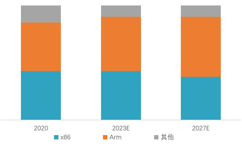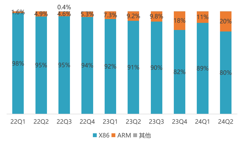 IDC的數據則顯示,中國服務器市場中ARM架構CPU佔比從22Q1的1.6%上升至24Q2的20%。