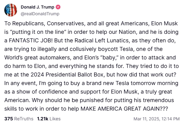 特朗普還説:他們試圖在2024年總統投票時也這麼抵制我,但有用嗎?不管怎麼説,我明天早上都要去買一輛全新的特斯拉,以表示我對馬斯克的信心和支持,他是一個真正偉大的美國人。為什麼他得因為把聰明才智用到“讓美國再次偉大”上而遭受懲罰?
