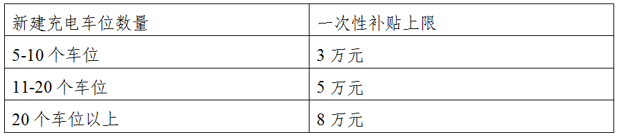 1.示範小區。對自本辦法實施之日起建成的示範小區充電設備,給予充電企業設備投資30%的補貼,直流、交流設施功率補貼上限分別為600元/千瓦、300元/千瓦;對示範小區業主大會,按新建充電車位數量給予一次性補貼,補貼標準見下表。