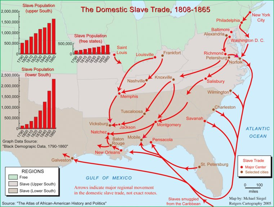 我們可以注意到,這張美國國內奴隸貿易的地圖上甚至有從自由州流向蓄奴州的貿易。對於美國奴隸制,一個常見的誤解就是隻有美國南方堅持奴隸制,北方冰清玉潔一直反對奴隸制。然而現實是,北方雖然很早就名義上廢除奴隸制,但奴隸獲得自由是一個漸進的過程,很多人要贖買自己的自由或者要等到一定年限。因此在自由州的奴隸完全獲得自由之前,奴隸主可以直接把他們賣給南方。