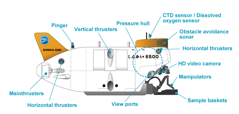 “深海6500”號潛水器是日本唯一一艘載人潛水器,由日本海洋開發研究機構(JAMSTEC)研發,被用於勘探海底資源,包括稀有金屬和其他礦物,以及地球科學、海洋地質學和地震活動測量等領域的研究和開發。