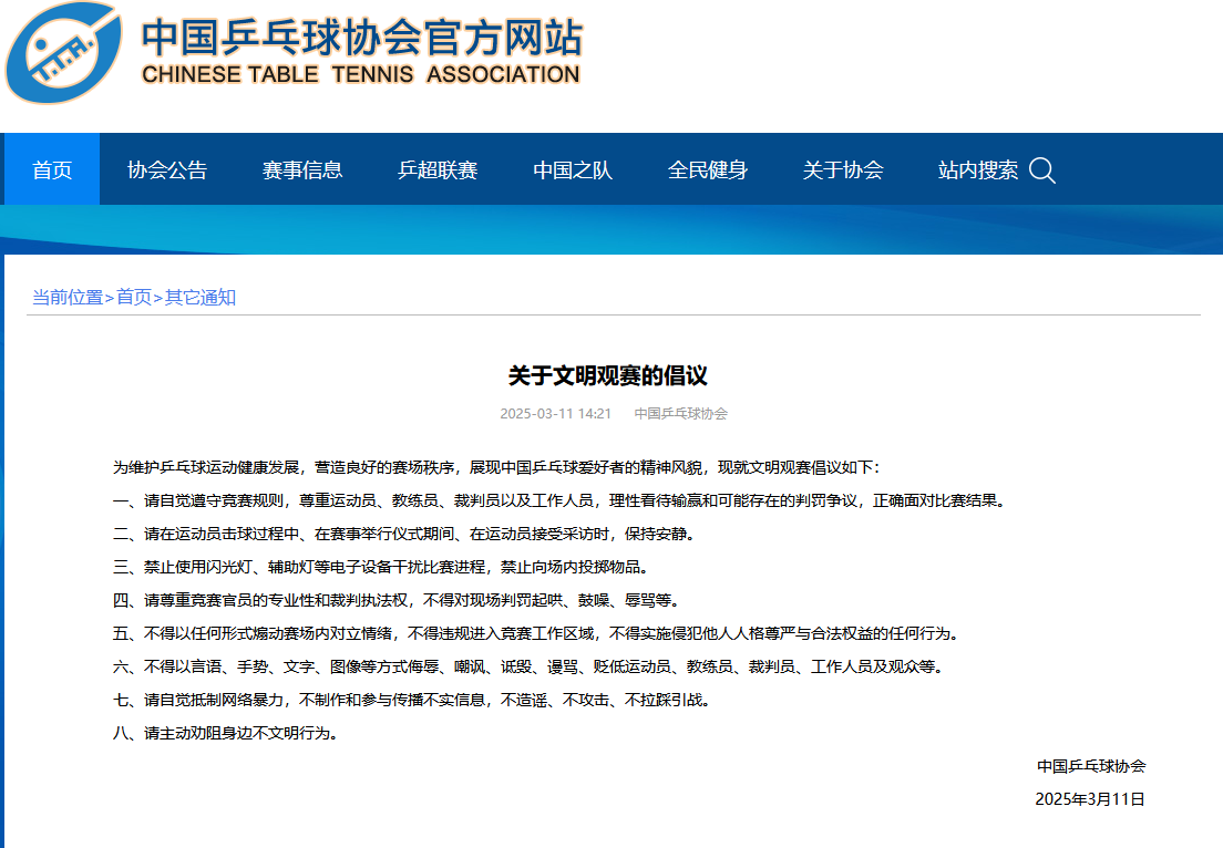 中國乒乓球協會官方網站11日發佈《關於文明觀賽的倡議》,《倡議》提出不得侮辱、謾罵運動員、教練員;不得以任何形式煽動賽場內對立情緒等。